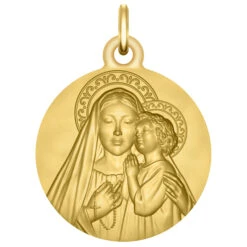 La médaille est un cadeau traditionnel des fêtes religieuses comme les baptêmes ou les communions : quoi de plus logique alors que d’offrir une représentation de la Vierge à l’enfant accompagnée d’un rosaire ? Cet objet, chapelet de grains avec une corde, permet au pratiquant de méditer et de prier sur les Mystères de la vie de Jésus. Sur cette médaille en or jaune, la Vierge tient son rosaire dans un moment de méditation profonde, auréolée, tandis que l’enfant Jésus prie à ses côtés. Ainsi, ils représentent à la fois la foi mais aussi l’amour filial. Modèle déposé.